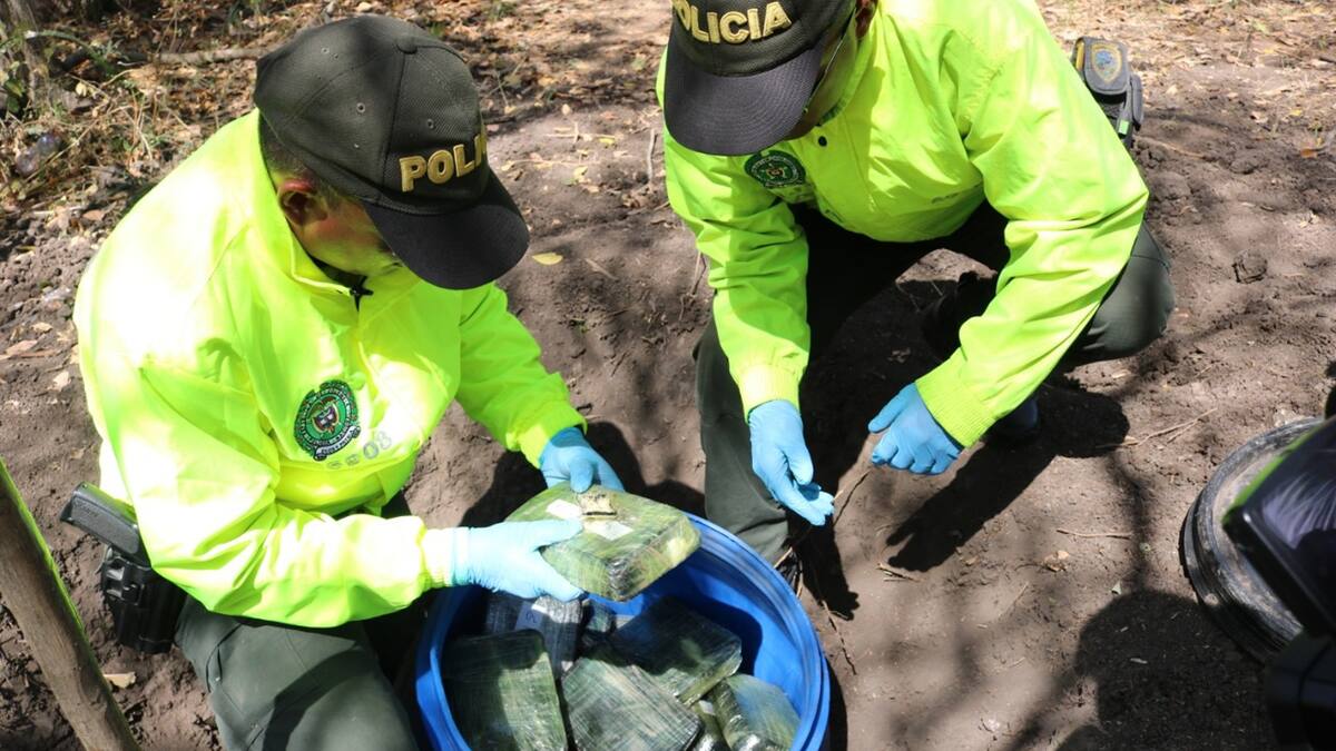 Asimismo, y con la ayuda del canino ‘Modric’, fueron halladas dos caletas enterradas en los potreros de la finca, que en dos tanques sellados herméticamente contenían 95 kilos de base de coca distribuida en panelas, marcadas con el número 125.