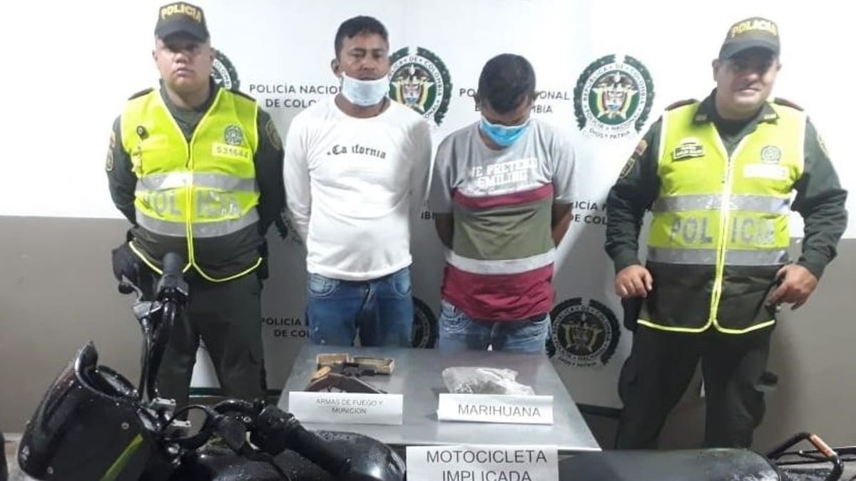 A los detenidos le incautaron dos armas de fuego: un revólver marca Colt, calibre 38 largo; y un arma de fuego de fabricación artesanal, también una motocicleta marca Auteco, modelo Bóxer, de color negro, número de matrícula GVW-30F.