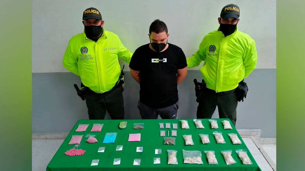 En el lugar capturaron en flagrancia a Alfredo Jaime Moreu Jaimes, de 23 años, a quien le hallaron en su poder 526 pastillas de anfetaminas con anillo sustituido (éxtasis), con un peso de 257 gramos; 1.232 gramos de anfetaminas con anillo sustituido (éxtasis); 21 gramos de sustancia en polvo color azul, positiva para anfetaminas (2CB), 7 gramos de sustancia en polvo color rosado, positiva para anfetaminas (2CB), 8 gramos de cocaína y 46 gramos de marihuana.