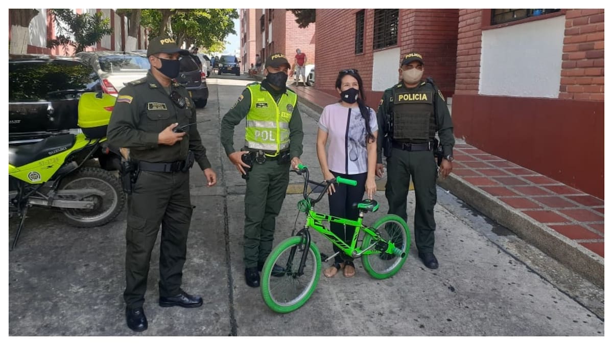 A los patrulleros James Jiménez y Jhony Castro, adscritos al CAI Surisalcedo, les correspondió darle la buena nueva a un pequeño de 11 años: su bicicleta fue recuperada.
