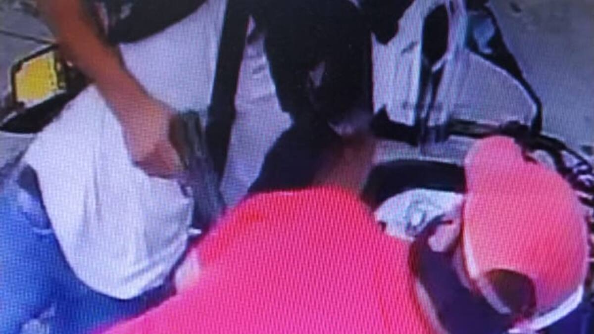 El primer cliente, terminado el servicio, le paga la gasolina al empleado y se retira de la bomba mientras este se dirige a la otra motocicleta. Uno de los hombres, el que estaba cercano al vehículo, le paga por adelantado al trabajador para que este llene el tanque de la moto. Con la manquera aún en el tanque, el segundo hombre desenfunda un arma de fuego y se acerca al empleado intimidándolo para quitarle el dinero que tiene en las manos.