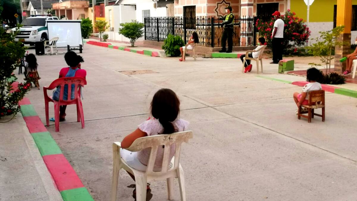 Una calle del barrio Recreo de Sabanagrande se convirtió en un teatro por una tarde. Niños de todas las edades salieron de sus casas por un breve espacio de tiempo para disfrutar de una película infantil, pero también para aprender sobre la pandemia que enfrenta el mundo, eso sí, guardando el distanciamiento social.