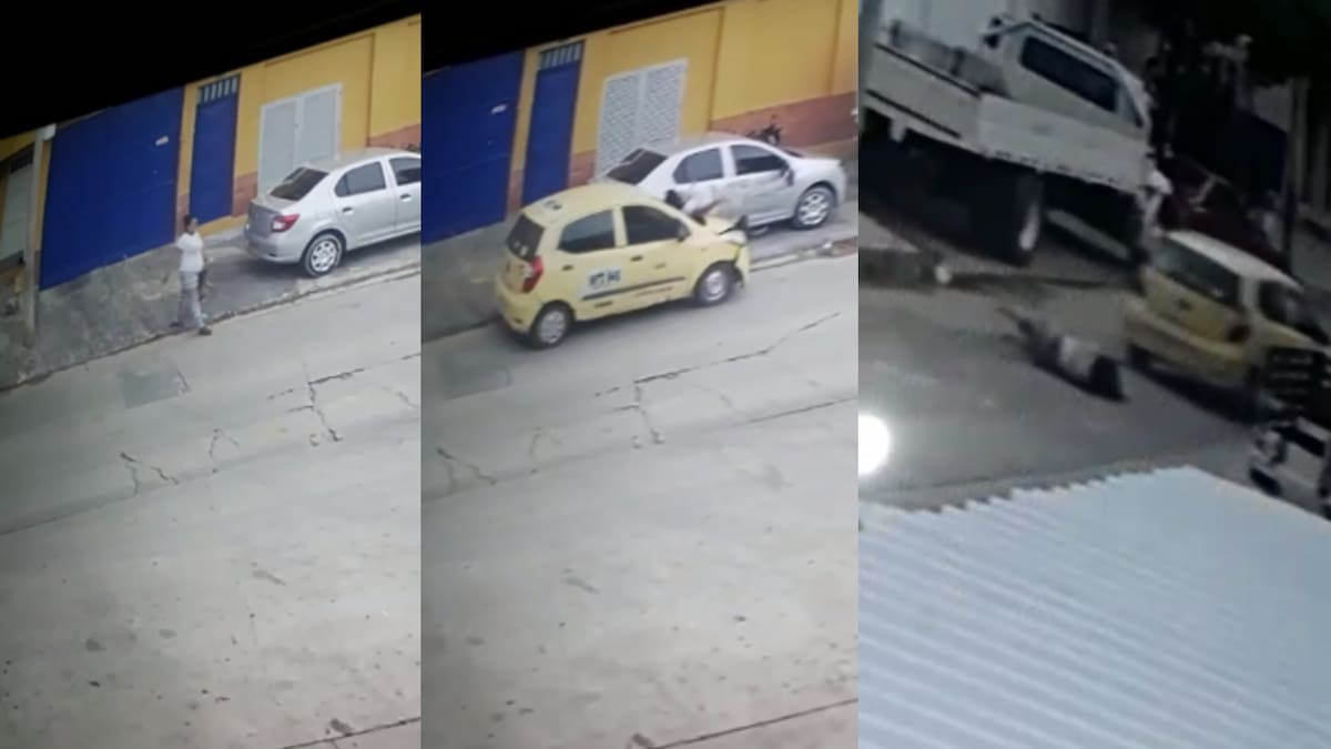 El vehículo Hiunday amarillo de placas WFZ 948 se desplazó varios metros llevando a la mujer sobre el capó del carro, mientras ella sostenía de la mano al pequeño. Pronto, el niño se suelta y cae al suelo perdiendo la conciencia en el acto. La madre, segundos después, también cae, pero frente al taxi y sin que este se detenga.