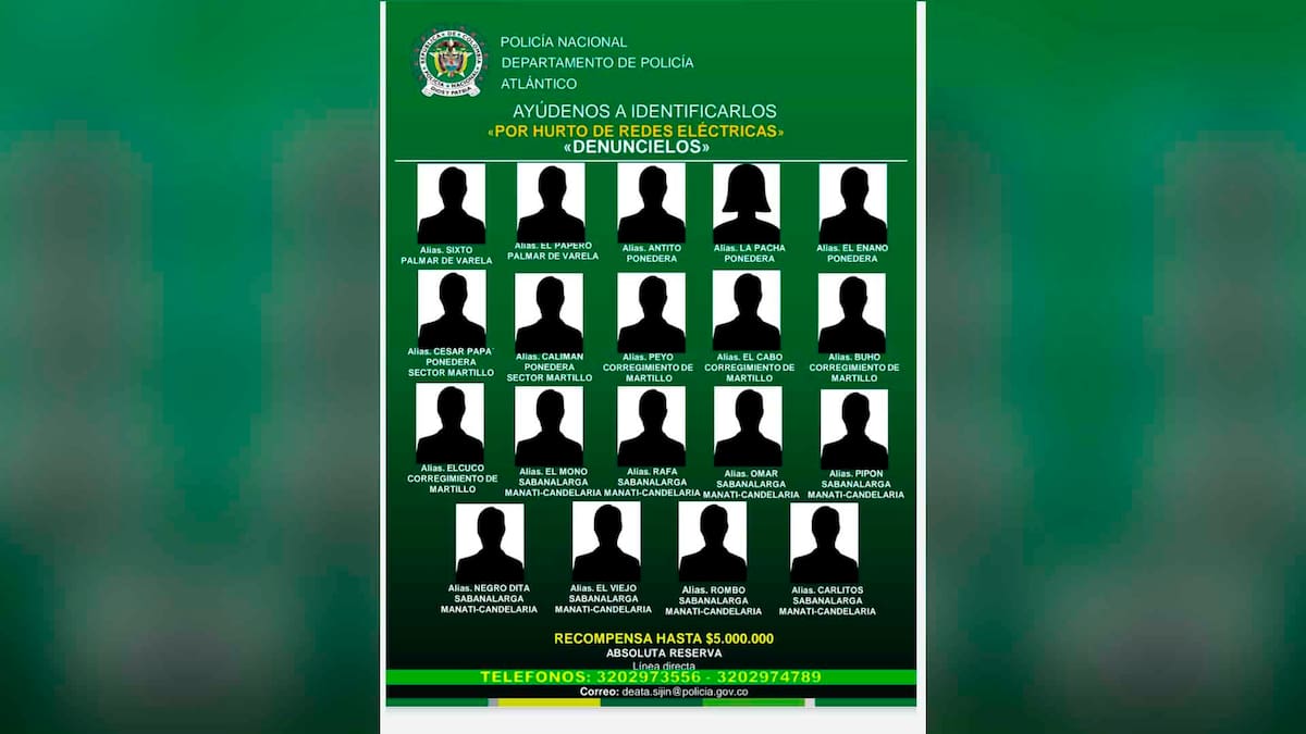 La Policía del Atlántico dio a conocer este lunes el cartel de los más buscados por el robo de redes eléctricas en el departamento. El afiche se presentó de 19 figuras etiquetadas con el alias de los ladrones y el territorio en el que suelen operar, con el objetivo de que los ciudadanos ayuden a ponerle rostro a los delincuentes que tienen afectados sobre todo a Palmar de Varela, Ponedera, el corregimiento de Martillo, Manatí, Candelaria y Sabanalarga.