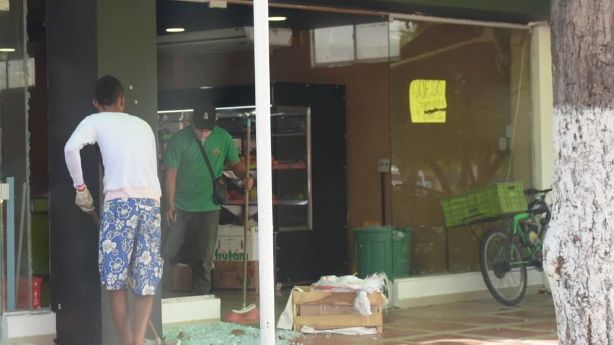 En la mañana de este miércoles los trabajadores del establecimiento comercial de razón social La Canasta estaban recogiendo con palas los vidrios que se rompieron la noche del martes a causa de un proyectil disparado en medio de un atraco.