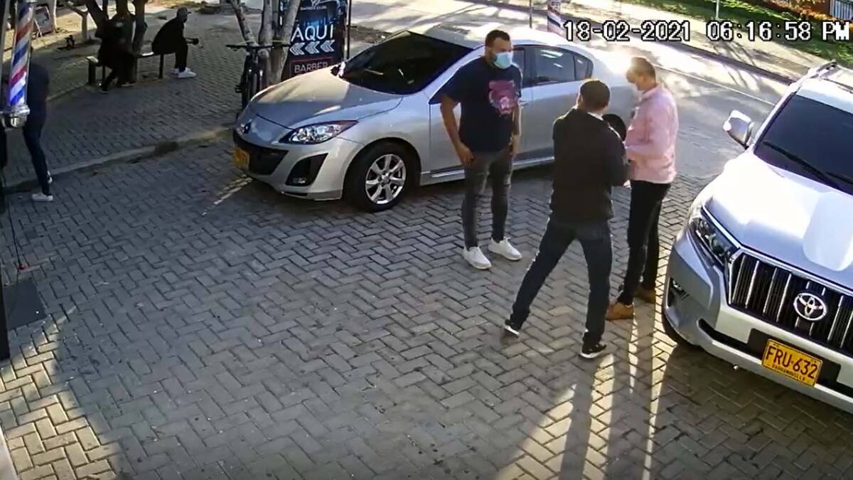 En este video de una cámara de seguridad, se observa cómo dos hombres se encuentran en la parte exterior de unos locales comerciales dialogando, cuando de repente son abordados por un atracador que con un arma de fuego los amedrantó y se les llevó sus celulares.
