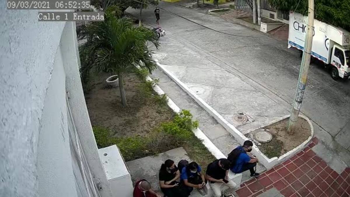 A través de la grabación de una cámara de seguridad ubicada en la calle 58 con carrera 36, barrio El Recreo, se observa cómo un ladrón con un arma de fuego en mano intimida a los trabajadores de una empresa que se encuentran sentados sobre un muro y les quita las pertenencias. El caso se registró este martes.