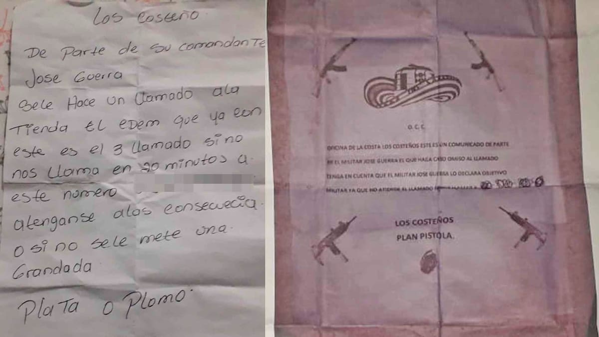 Pero, no solo son los audios amenazantes de Otón, sino que también les envían a los comerciantes panfletos en los que hay mensajes que los llenan de temor. En uno de ellos se leen números de teléfonos con los que las víctimas deben comunicarse con los extorsionistas.