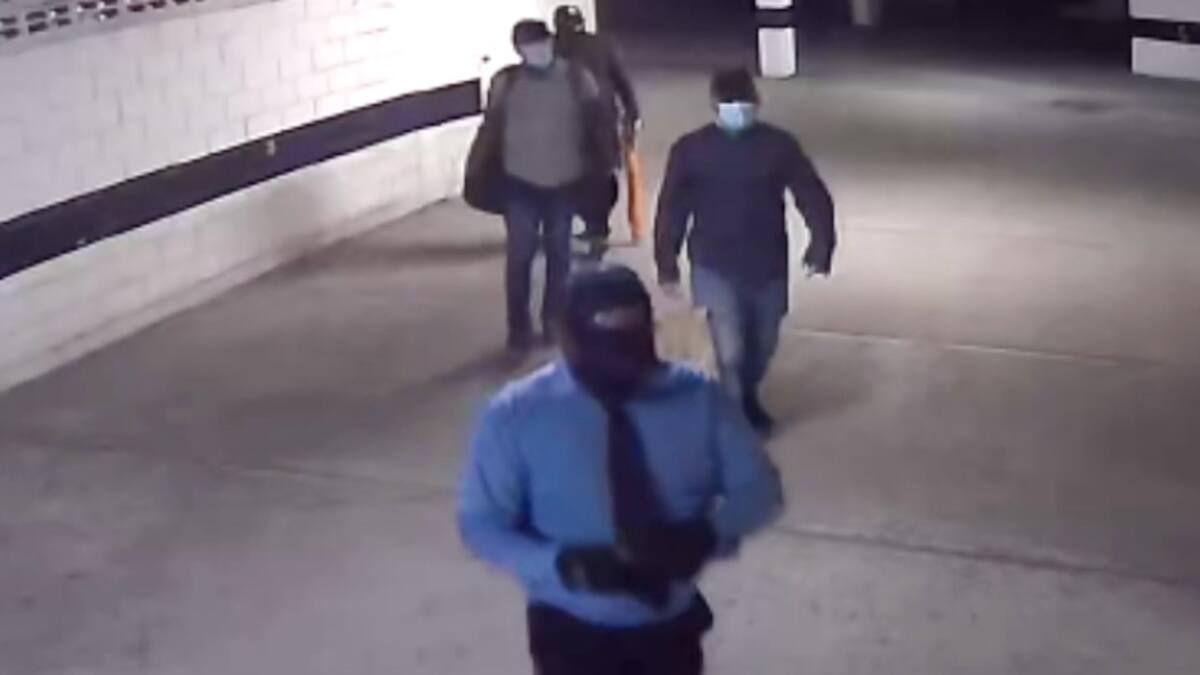 En otra cámara de seguridad se observa cuando el vigilante acompaña a los tres delincuentes, a los que, al parecer, los lleva hasta las tres oficinas donde se cometió el millonario hurto.