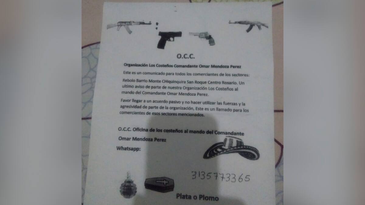La imagen de dos fusiles AK-47, así como la de un sombrero vueltia’o y una granada, ilustran un panfleto que recientemente apareció en negocios del Centro de Barranquilla, especialmente en los barrios Chiquinquirá y San Roque.