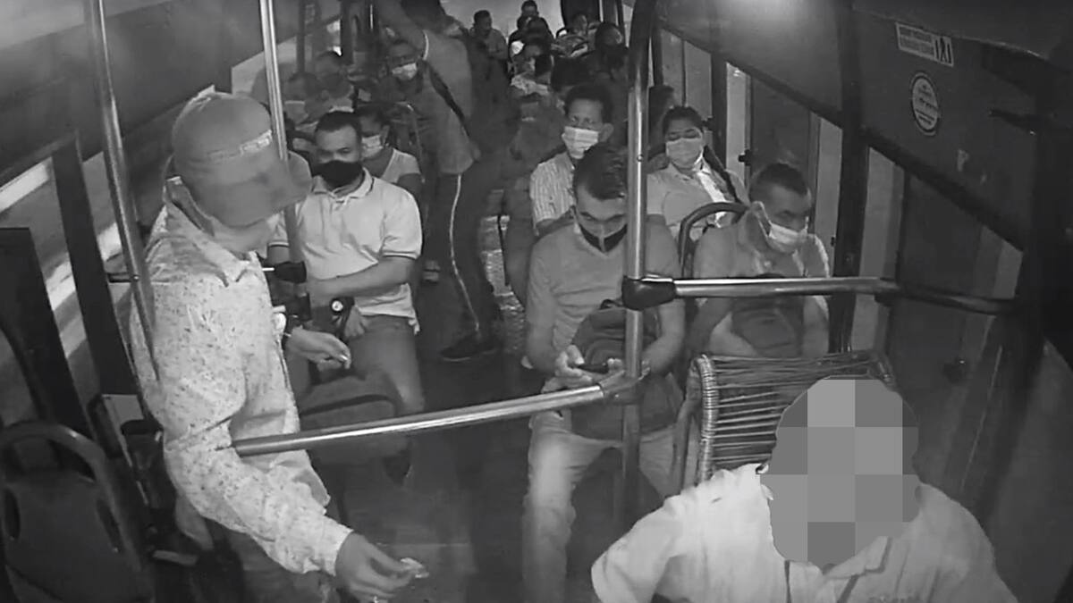 En las cámaras de seguridad de un bus de la empresa Sobusa quedó registrado el momento justo en que tres individuos amenazan con cuchillos a los pasajeros que iban en el vehículo de transporte público para despojarlos de sus pertenencias.
