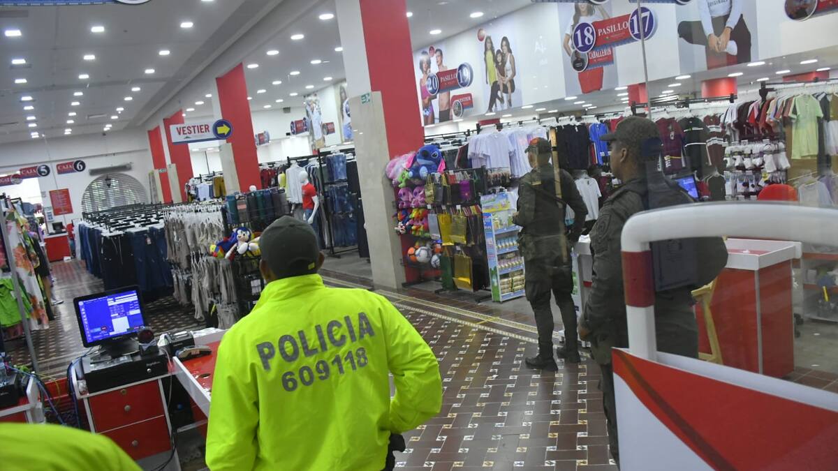 Uniformados de la Policía, detectives de la Sijín y funcionarios del CTI de la Fiscalía inspeccionan al mediodía de este martes las sedes del almacén Tierra Santa ubicadas en el Centro Comercial Portal del Prado y de la calle 72 con carrera 45, en la localidad Norte-Centro Histórico de Barranquilla.