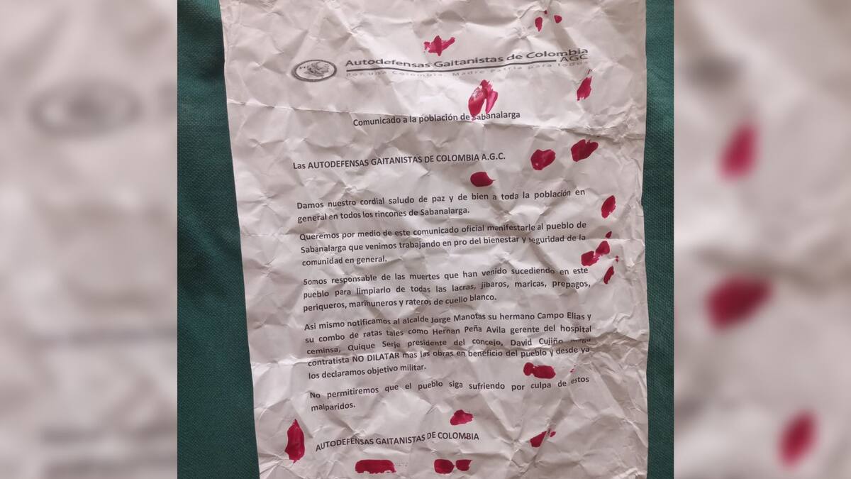 Uniformados adscritos a la Seccional de Investigación Judicial –Sijín- y la Seccional de Inteligencia –Sipol- de la Policía del Atlántico comenzaron a indagar un panfleto supuestamente firmado por las Autodefensas Gaitanistas de Colombia AGC o Clan del Golfo en el que declaran como 'objetivo militar' a Jorge Manotas, alcalde del municipio de Sabanalarga, y además, en el que se adjudican crímenes recientes en esa población.