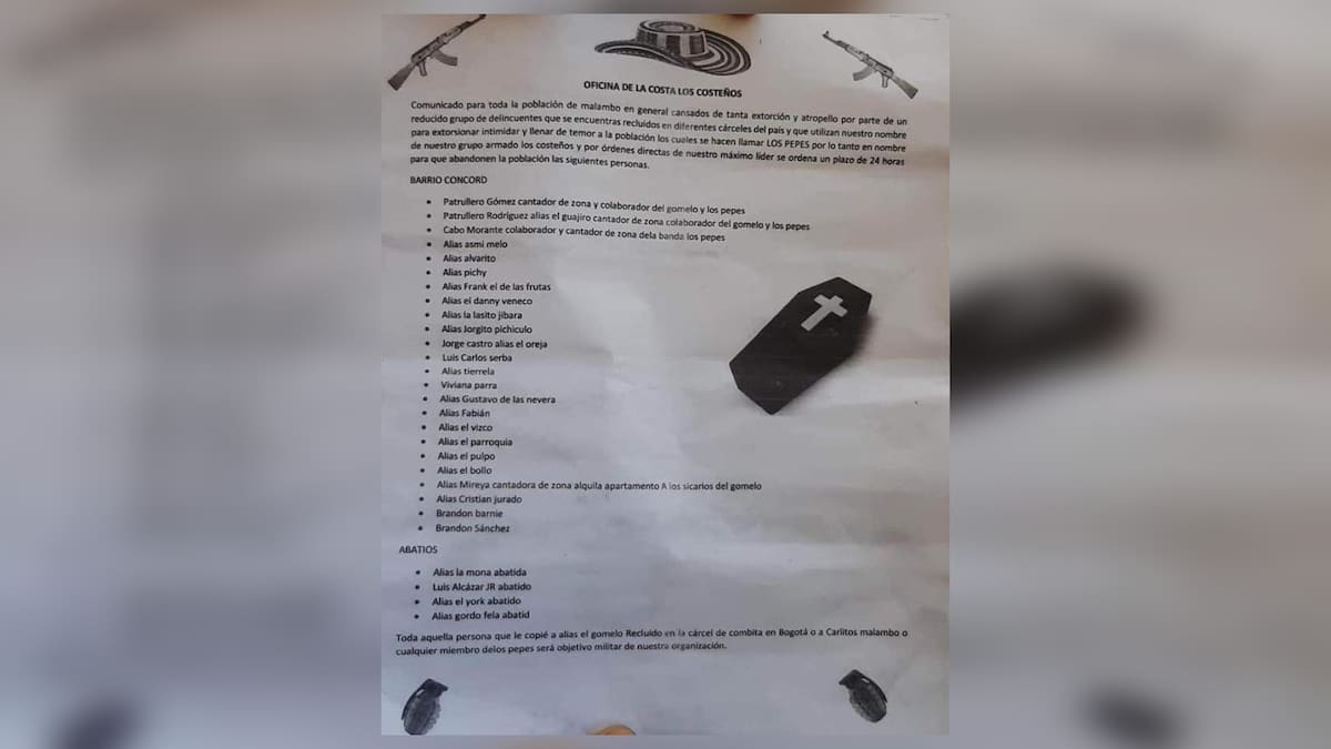 Luego de que empezara a circular un panfleto amenazante contra supuestos agentes de la Policía Metropolitana de Barranquilla adscritos al comando de la institución armada en Malambo y contra un listado de personas que pertenecerían a un sector específico de la población, la administración municipal confirmó que se verifica la autenticidad del impreso a nombre de la ‘Oficina de la Costa Los Costeños’.