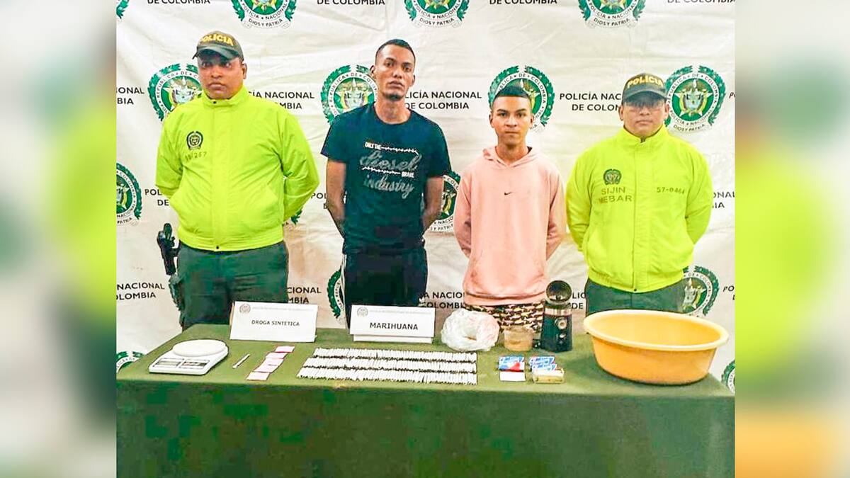 'En Alameda del Río, gracias a información (fuente humana) y el trabajo articulado con la comunidad, logramos la captura de dos delincuentes dedicados al tráfico de estupefacientes. Estos bandidos se dedicaban a distribuir sustancias alucinógenas entre las personas y los jóvenes del sector', dijo el general Urquijo.