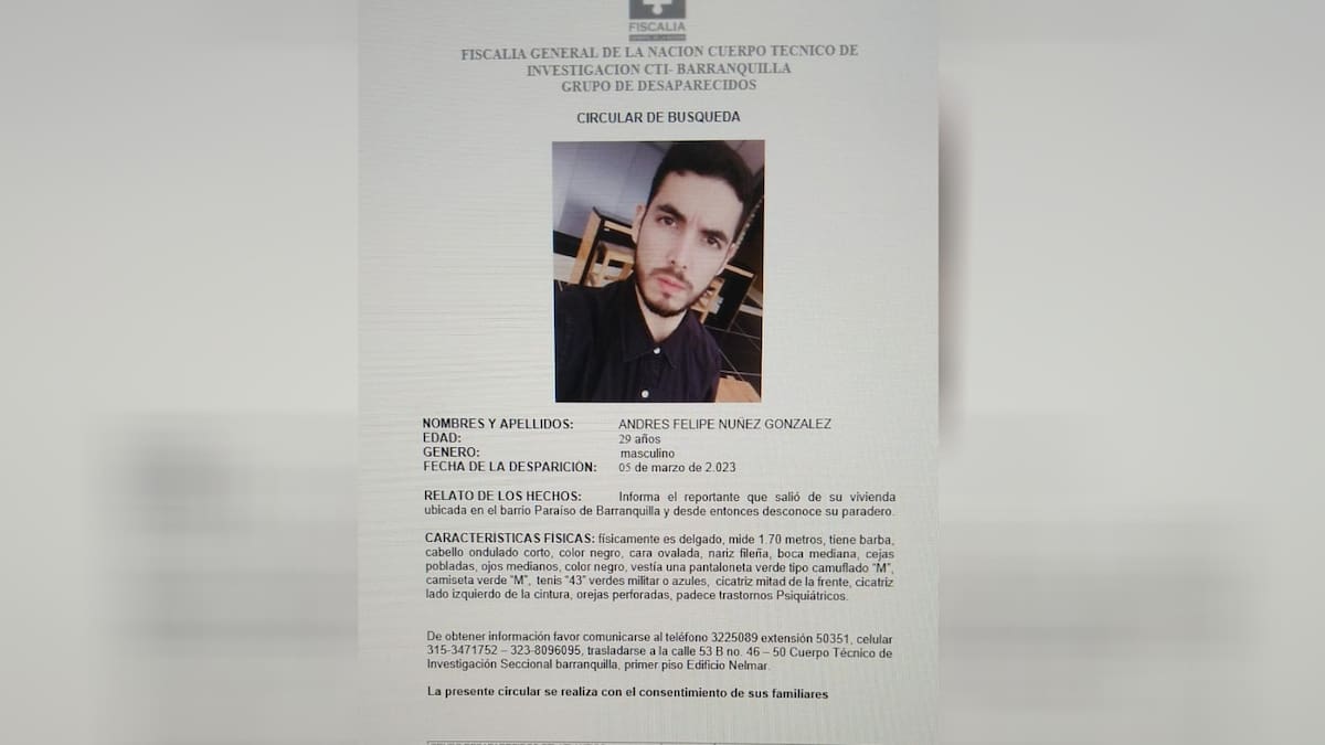 A través de una circular de búsqueda del Grupo de Desaparecidos del CTI de la Fiscalía se reportó la desaparición de un hombre identificado como Andrés Felipe Núñez González, de 29 años, vecino del barrio Paraíso, en la localidad Riomar, en el norte de Barranquilla.