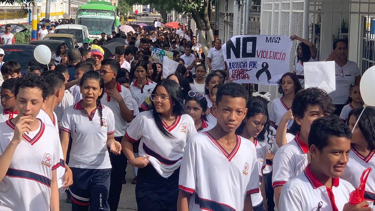 Con globos blancos y pancartas, decenas de estudiantes marcharon por las calles de los barrios Ciudadela Metropolitana y Soledad 2000, en el municipio de Soledad, para exigir justicia en la muerte del niño de 12 años David Molina.