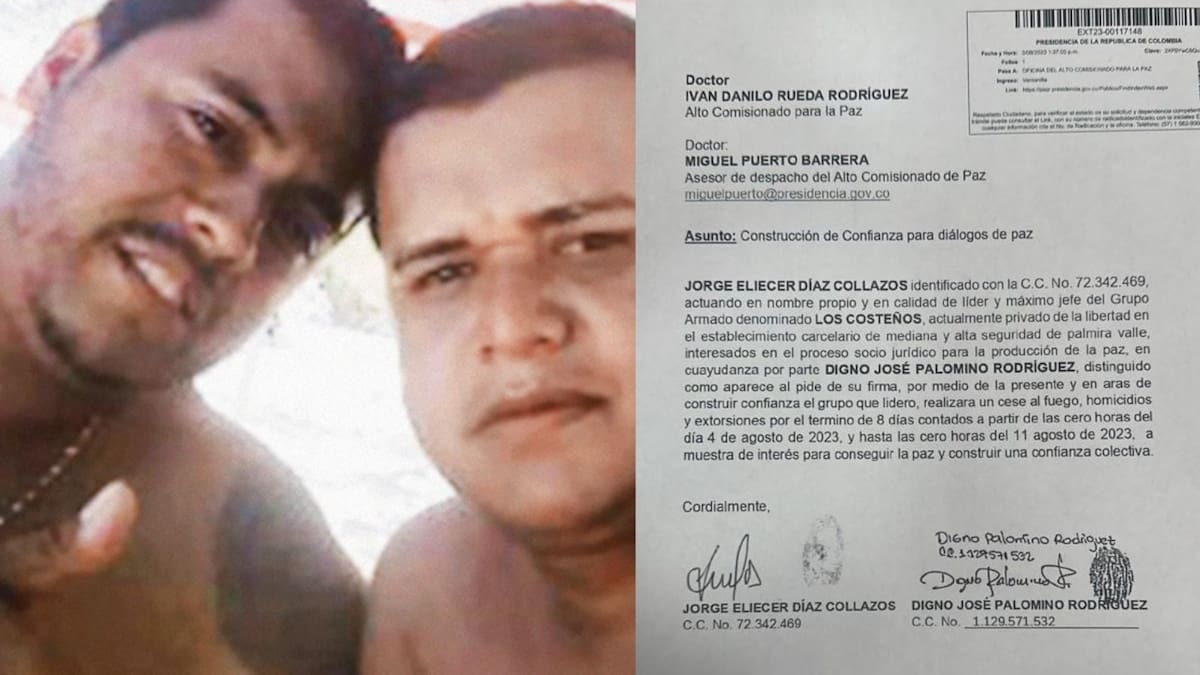'Jorge Eliécer Díaz Collazos, actuando en nombre propio y en calidad del líder y máximo jefe del grupo armado denominado ‘Los Costeños’, actualmente privado de la libertad en el establecimiento carcelario de mediana y alta seguridad de Palmira, Valle, interesado en el proceso socio jurídico para la producción de la paz, en coadyuvancia por parte de Digno José Palomino Rodríguez, distinguido como aparece al pie de su firma, por medio de la presente y en aras de construir confianza el grupo que lidero realizará un cese al fuego de homicidios y extorsiones por el término 8 días, contados a partir de las cero horas del 4 de agosto 2023 y hasta las 0 horas del 11 de agosto de 2023, a muestra de interés para conseguir la paz y construir una confianza colectiva', se lee en la carta y que tiene como asunto 'Construcción de confianza para diálogos de paz'.