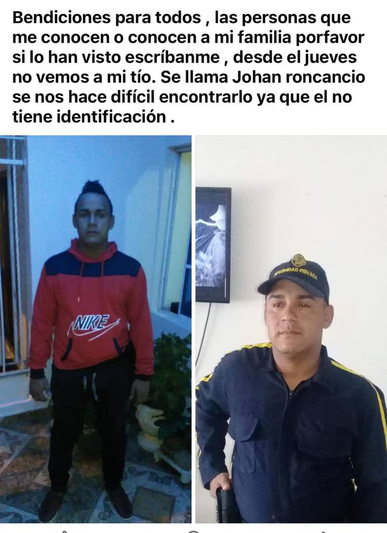 Desde hace varios días, familiares de Roncancio publicaron mensajes en redes sociales pidiendo información que permitiera encontrar al tío de Teo: “Bendiciones para todos , las personas que me conocen o conocen a mi familia porfavor si lo han visto escríbanme , desde el jueves no vemos a mi tío. Se llama Johan Roncancio se nos hace difícil encontrarlo ya que él no tiene identificación”, señaló una de sus sobrinas.