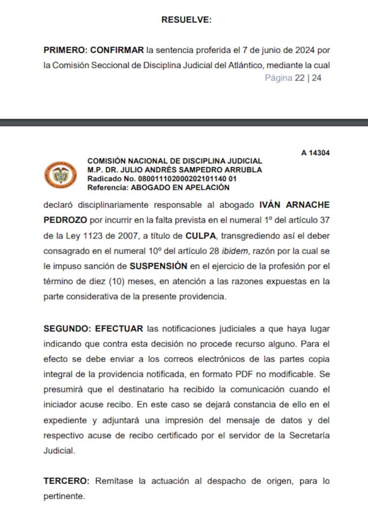 Por lo anterior, a través de fallo con ponencia del magistrado Julio Andrés Sampedro Arrubla, la Comisión Nacional de Disciplina Judicial dejó en firme la decisión de primera instancia que suspendió al abogado por el término de 10 meses.