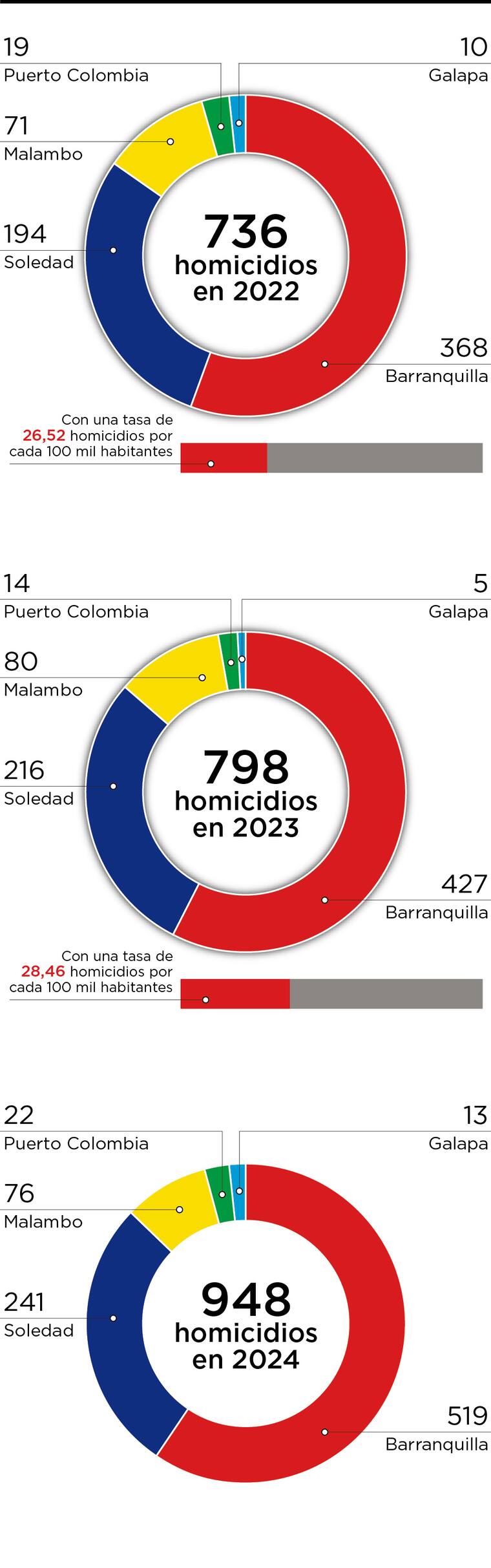 De ese número global, Barranquilla y su área metropolitana registraron 871 eventos, de acuerdo con los indicadores del Instituto de Medicina Legal, los cuales fueron un poco distintos a los de la propia Policía Metropolitana, que sumó en su jurisdicción para todo el periodo 846 casos. Esta diferencia, al parecer, estaría enmarcada en otros tipos de muertes violentas o por establecer.