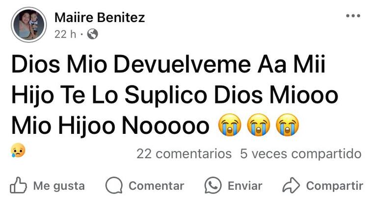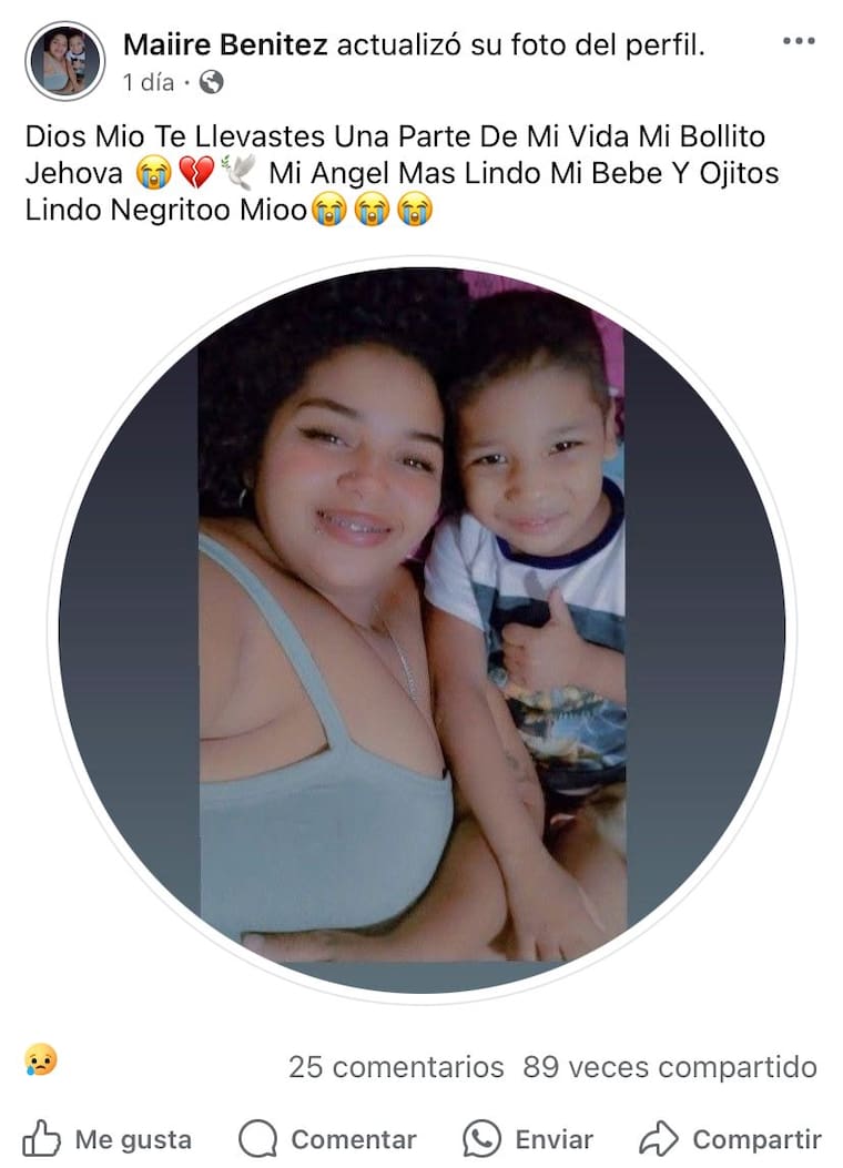 A través de su cuenta de Facebook, Maire Benítez ha expresado su profundo dolor por la muerte de su pequeño, subiendo fotografías de Jeikol José Acosta Benítez y escribiendo conmovedores mensajes.