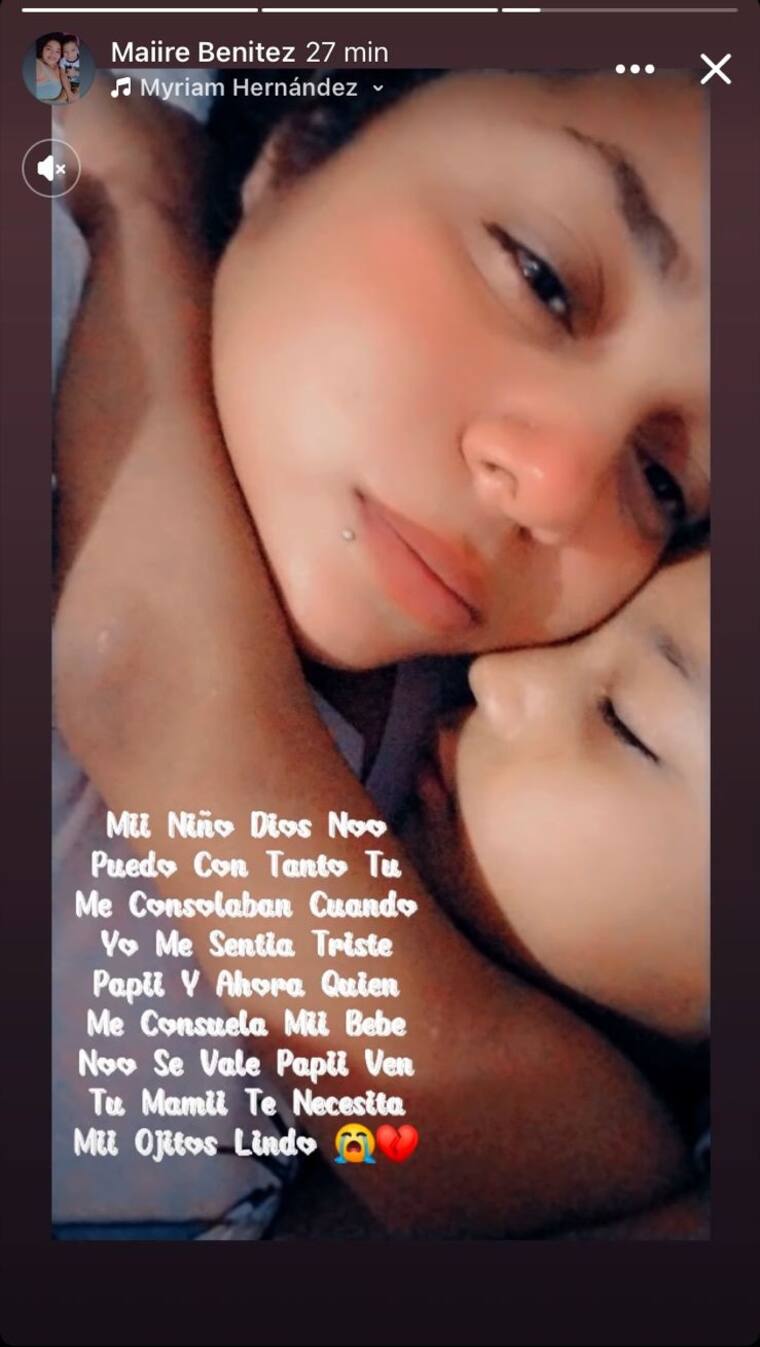 En una ‘historia’ de Facebook, Maire Benítez compartió una fotografía en la que aparece abrazada con su hijo y el mensaje: “Mi niño. Dios, no puedo con tanto. Tú me consolabas cuando yo me sentía triste, papi. Y ahora quién me consuela, mi bebé. No se vale, papi. Ven, tu mami te necesita, mi ojitos lindos”.