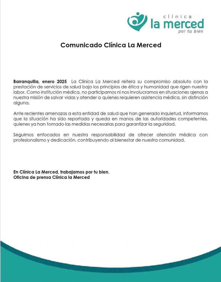 Y párrafo seguido detalló que como institución médica “no participamos ni nos involucramos en situaciones ajenas a nuestra misión de salvar vidas y atender a quienes requieren asistencia médica sin distinción alguna. Ante recientes amenazas a esta entidad de salud que han generado inquietud, la Clínica La Merced reitera que ya han tomado las medidas necesarias para garantizar la seguridad. Seguimos enfocados en nuestra responsabilidad de ofrecer atención médica con profesionalismo y dedicación, contribuyendo al bienestar de nuestra comodidad”.