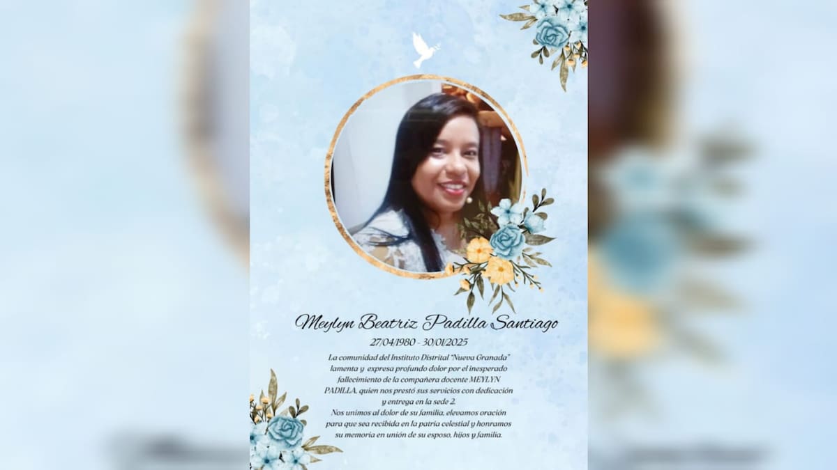 “La comunidad del Instituto Distrital Nueva Granada lamenta y expresa profundo dolor por el inesperado fallecimiento de la compañera docente Meylyn Padilla, quien nos prestó sus servicios con dedicación y entrega en la sede 2… Nos unimos al dolor de su familia, elevamos oración para que sea recibida en la patria celestial y honramos su memoria en unión de su esposo, hijos y familia”, publicó la institución educativa a través de sus cuentas de redes sociales.