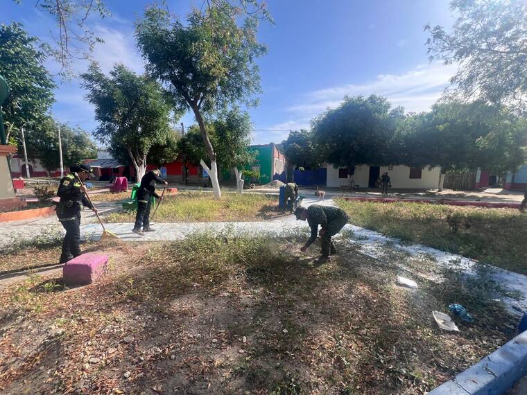 El sol de febrero se posa con suavidad sobre el parque principal de El Salado, mientras un grupo de policías e infantes de marina, con escobas y brochas en mano, transforman cada rincón del espacio.