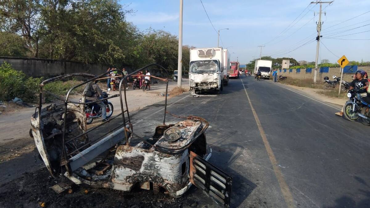 Tras la fuerte colisión, la pareja de esposos salieron eyectados del motocarro, quedando tendidos en el duro pavimento. Testigos que circulaban por la zona manifestaron que el choque fue tan violento que el vehículo empezó a incendiarse y terminó reducido a cenizas y piezas de metal calcinadas.