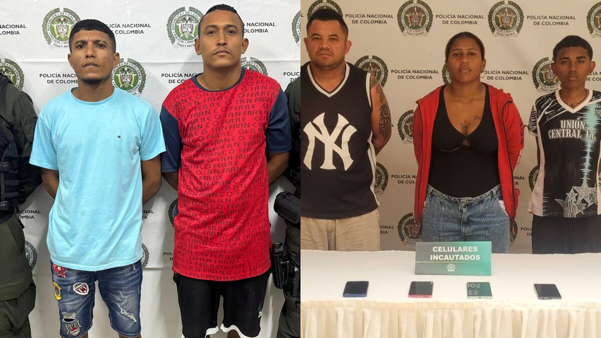 Los capturados fueron identificados como Alexander Miranda Herrera, alias Alex, de 27 años, José Luis Viloria Salcedo, alias Viloria, de 33 años, Jorge Luis Valencia Conrado alias Pimpi, de 33 años, Camila Andrea Pacheco Acosta, alias Camila, de 23 años, y Carlos Manuel Moreno Garizábalo, alias Carlos, de 19 años de edad.