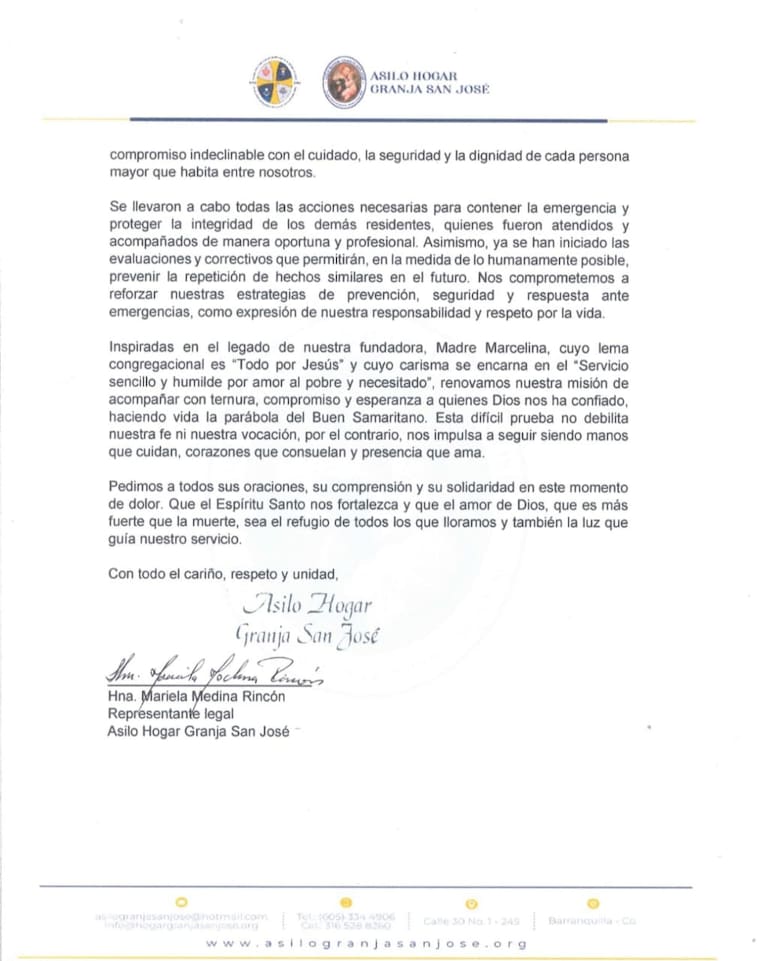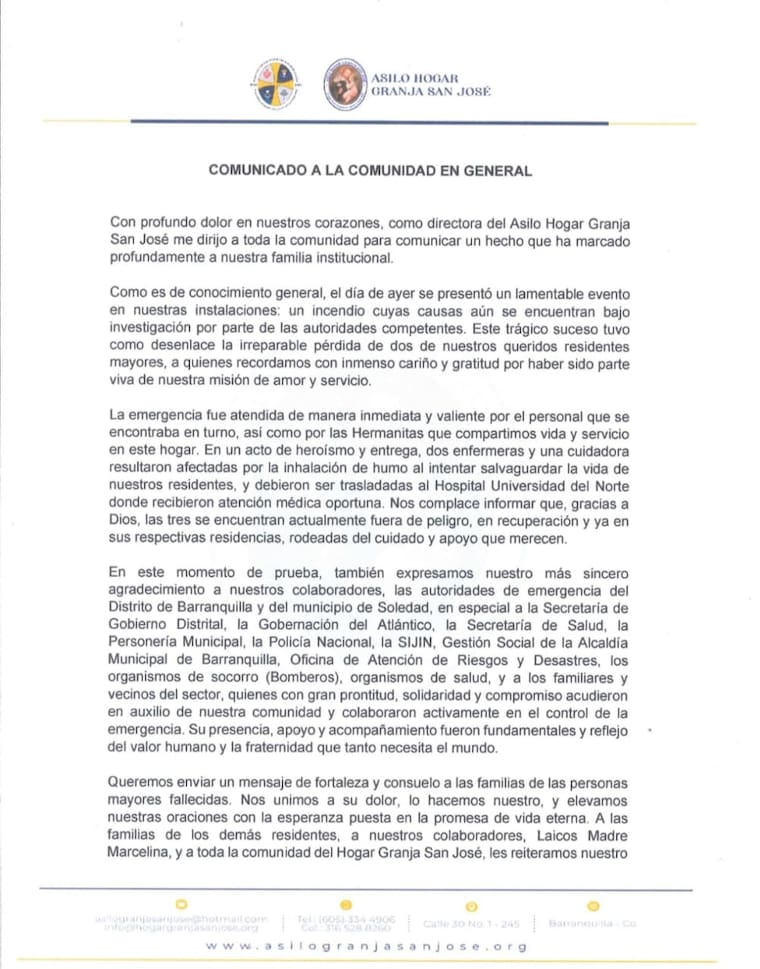 “En un acto de heroísmo y entrega, dos enfermeras y una cuidadora resultaron afectadas por la inhalación de humo al intentar salvaguardar la vida de nuestros residentes, y debieron ser trasladadas al Hospital Universidad del Norte donde recibieron atención médica oportuna. Nos complace informar que, gracias a Dios, las tres se encuentran actualmente fuera de peligro, en recuperación y ya en sus respectivas residencias, rodeadas del cuidado y apoyo que merecen”, añadió la hermana Mariela Medina.