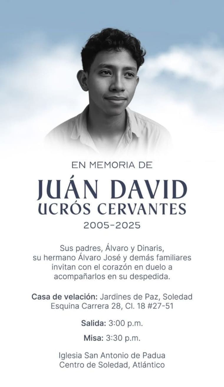Álvaro Ucros y Dinaris Cervantes, padres del joven, con sus corazones en duelo, invitaron a todos a acompañar a Juan David, a quien cariñosamente se le conocía como ‘Juanda’, hasta su última morada en un camposanto del vecino municipio de Soledad.