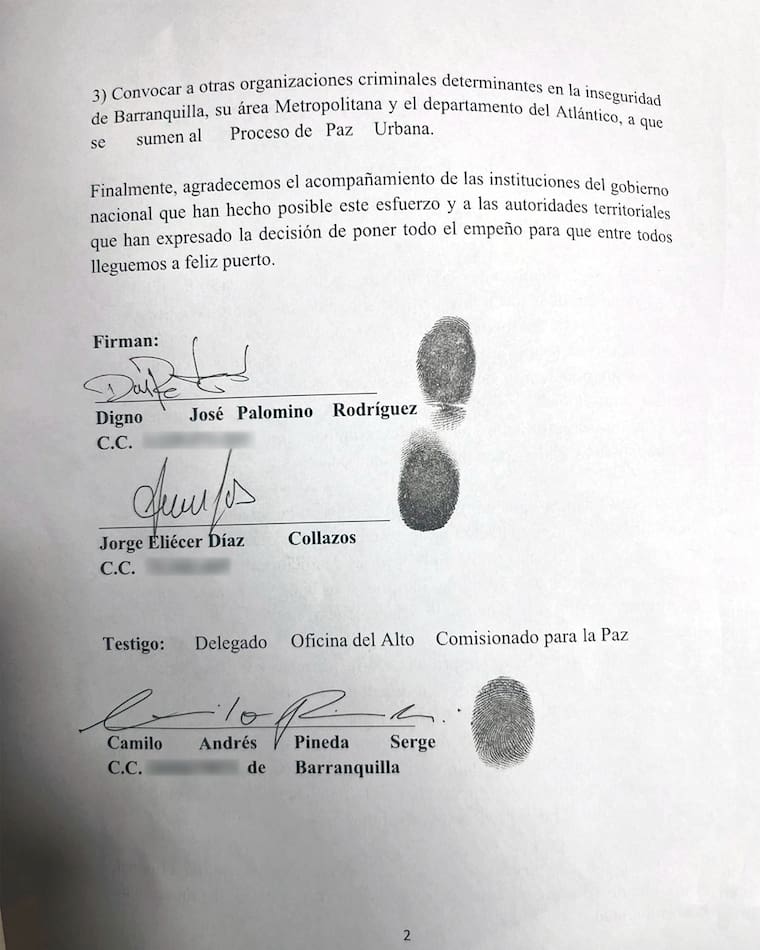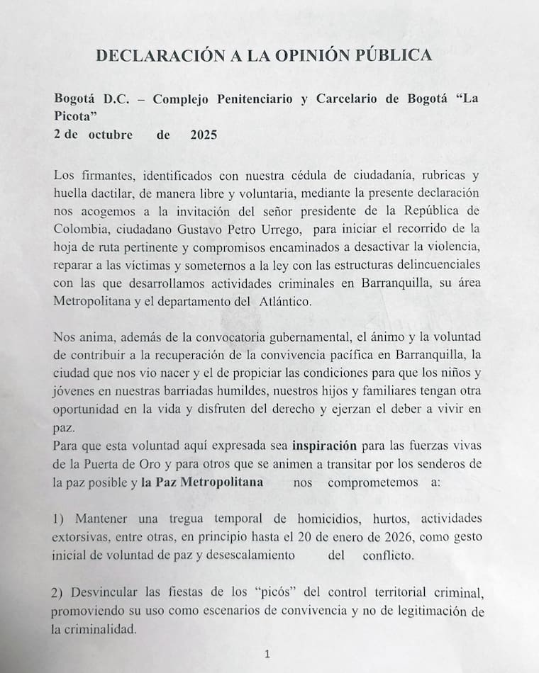 “Los firmantes, identificados con nuestra cédula de ciudadanía, rubricas y huella dactilar, de manera libre y voluntaria, mediante la presente declaración nos acogemos a la invitación del señor presidente de la República de Colombia, ciudadano Gustavo Petro Urrego, para iniciar el recorrido de la hoja de ruta pertinente y compromisos encaminados a desactivar la violencia, reparar a las víctimas y someternos a la ley con las estructuras delincuenciales con las que desarrollamos actividades criminales en Barranquilla, su área Metropolitana y el departamento del Atlántico”, leyó el jefe de ‘los Costeños’.