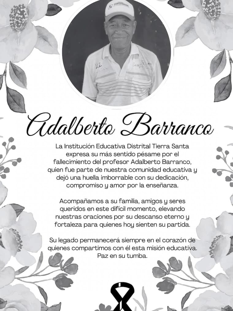 “La Institución Educativa Distrital Tierra Santa expresa su más sentido pésame por el fallecimiento del profesor Adalberto Barranco, quien fue parte de nuestra comunidad educativa y dejó una huella imborrable con su dedicación, compromiso y amor por la enseñanza”, se lee en el mensaje.