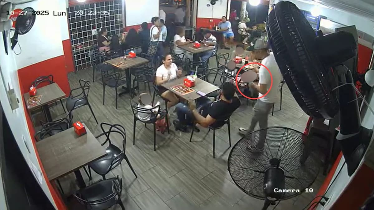 Por último, el delincuente llega a una cuarta mesa y se lleva elementos de valor de un grupo que compartía alimentos.
