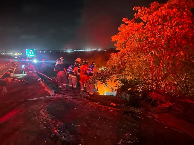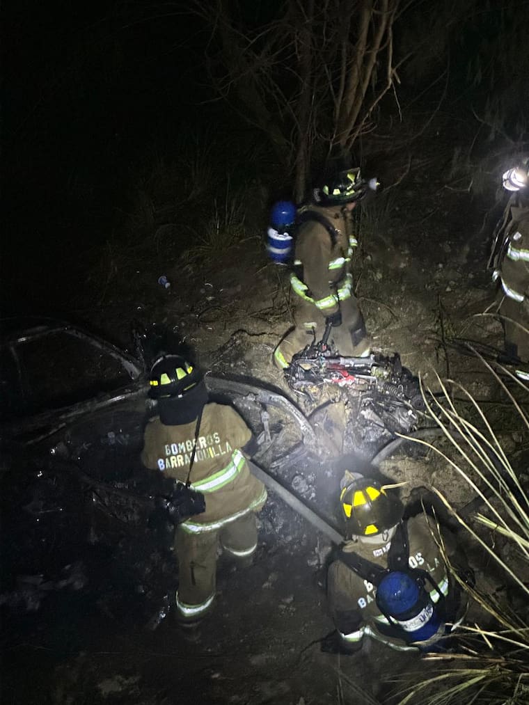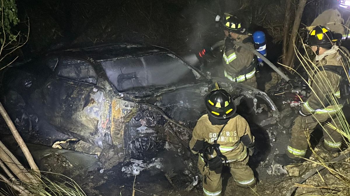 Miembros del Cuerpo de Bomberos de Barranquilla atendieron la emergencia con dos máquinas y evitaron que el fuego se propagara en la maleza en la que cayó el automotor conducido por el médico Viera Torres, quien sufrió golpes leves.