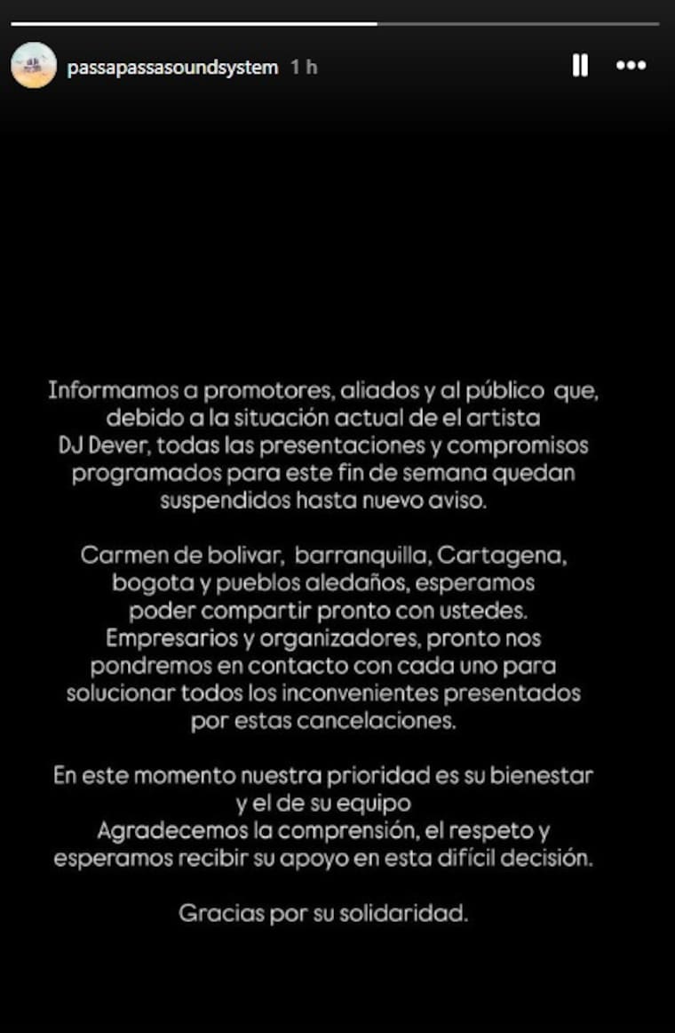 “Informamos a promotores, aliados y al público que, debido a la situación actual del artista DJ Dever, todas las presentaciones y compromisos programados para este fin de semana quedan suspendidos hasta nuevo aviso. Carmen de Bolívar, Barranquilla, Cartagena, Bogotá y pueblos aledaños esperamos poder compartir pronto con ustedes, empresarios y organizadores. Pronto nos pondremos en contacto con cada uno para solucionar todos los inconvenientes presentados por estas cancelaciones. En este momento nuestra prioridad es su bienestar y el de su equipo. Agradecemos la comprensión, el respeto y esperamos recibir su apoyo en esta difícil decisión. Gracias por su solidaridad”, se lee en la publicación.