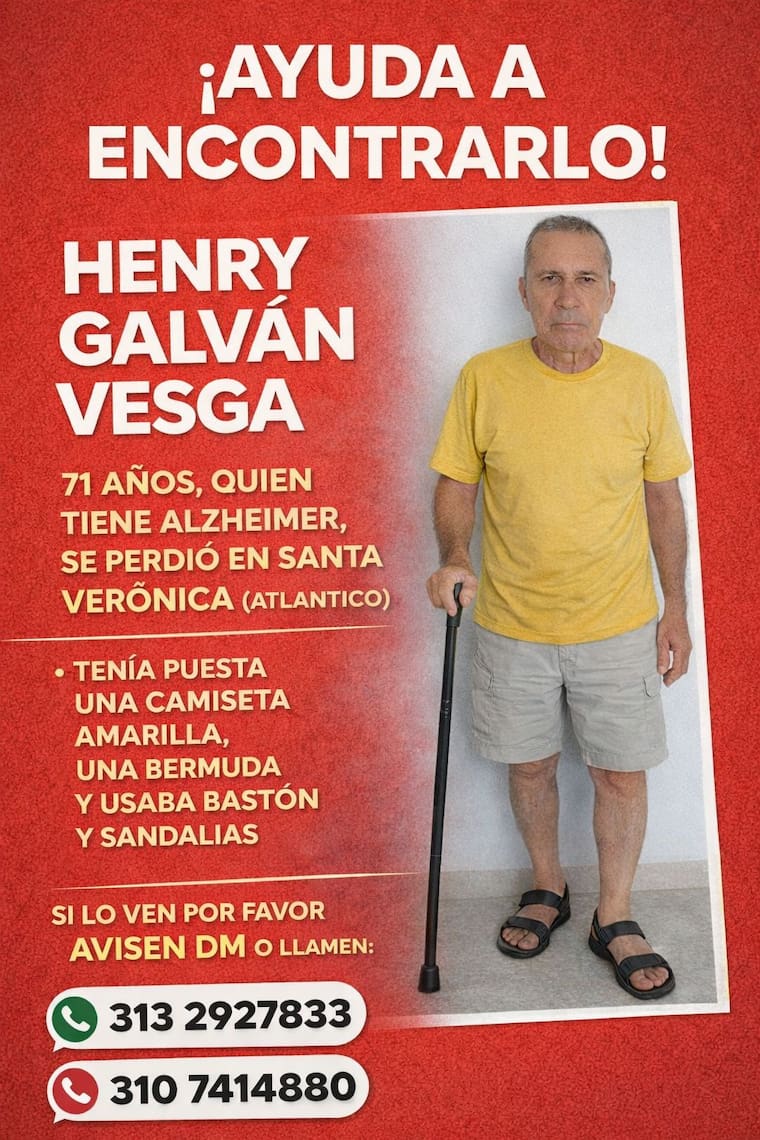 Horas de angustia pasan los allegados del adulto mayor Henry Galván Vesga luego de que fuera reportada su desaparición este domingo 15 de febrero en el balneario de Santa Verónica, en jurisdicción de Juan de Acosta.