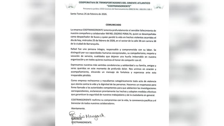 “La empresa COOTRANSORIENTE lamenta profundamente el sensible fallecimiento de nuestro compañero y colaborador Rafael Angel Osorio Peralta (…) Rafael fue una persona íntegra, responsable y comprometida con su labor. Se distinguió por sus capacidades humanas excepcionales, su compañerismo, respeto y vocación de servicio, cualidades que dejaron una huella imborrable en nuestra organización y en todos quienes tuvimos el honor de compartir con él”, se lee en el comunicado.