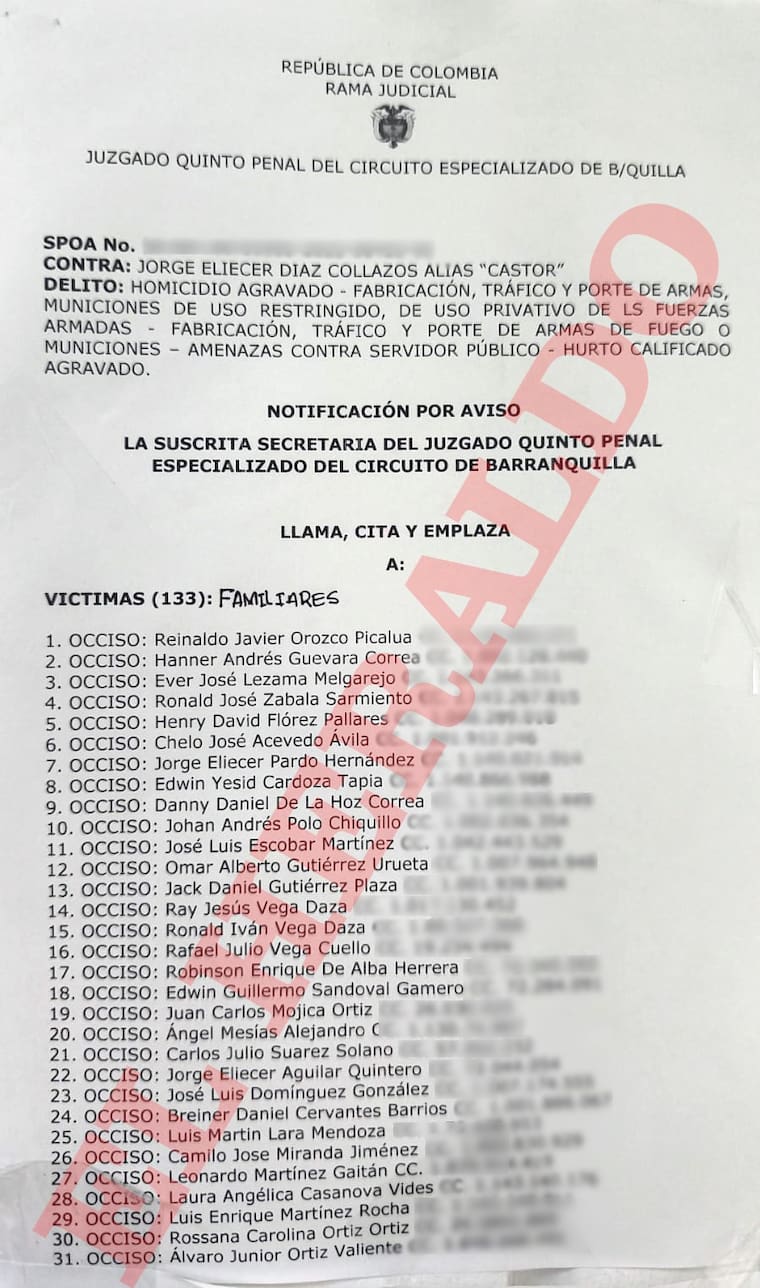 EL HERALDO tuvo acceso a unos documentos elaborados por la secretaría del despacho judicial en mención, en los que se citan a familiares de al menos 133 víctimas, entre fatales y lesionadas en ataques a bala, en hechos ocurridos en los últimos años, incluso cuando Díaz Collazos se encontraba recluido en prisión en el país de Venezuela, pero desde allá, de acuerdo con las mismas investigaciones, ordenaba crímenes en territorio colombiano.