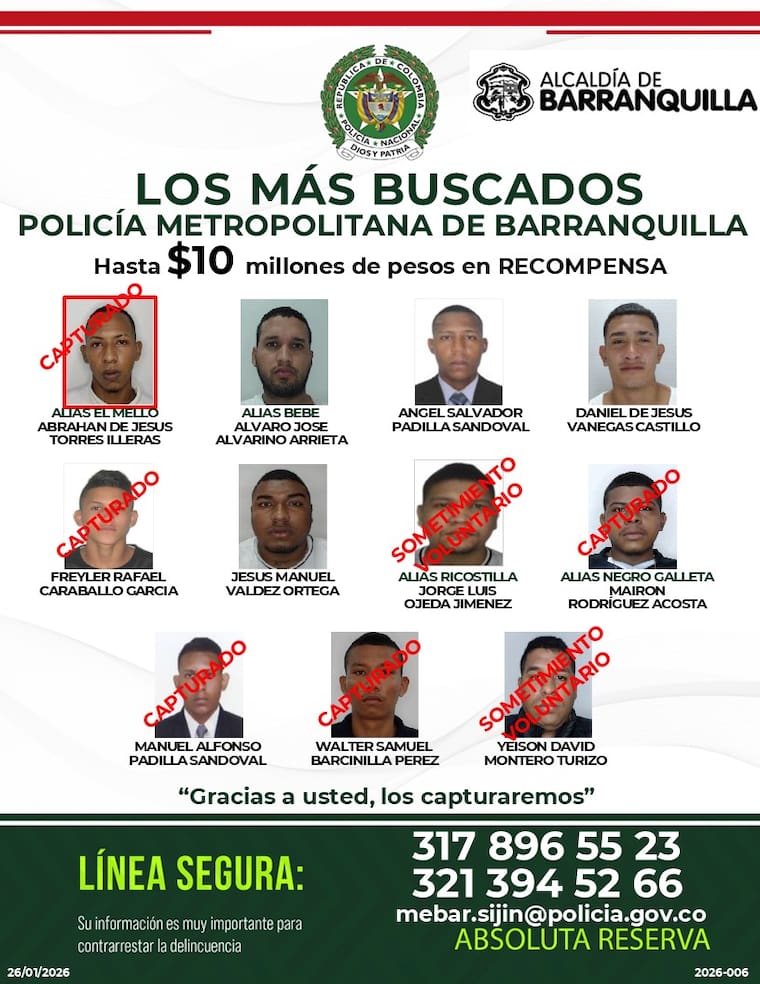 La Policía Metropolitana de Barranquilla confirmó la captura de uno de los hombres que aparece en el cartel de los más buscados por homicidio en Barranquilla y su área metropolitana. Se trata de alias El Mello, quien es requerido por los delitos de concierto para delinquir con fines de homicidio, porte ilegal de armas de fuego, tráfico de estupefacientes y extorsión.