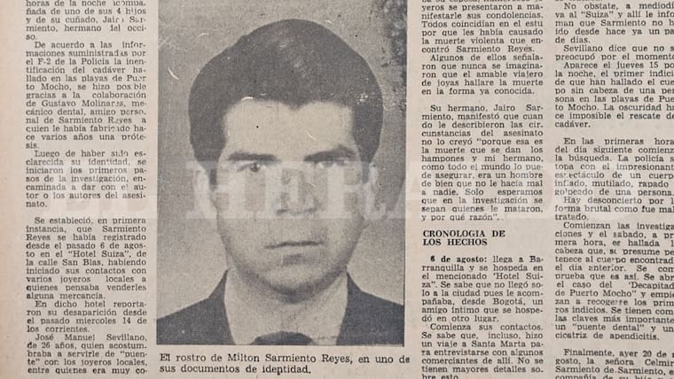 El misterio de la identidad convirtió el caso en comidilla de cada esquina barranquillera. Aproximadamente cuatro días le costó a los investigadores del escuadrón de la Policía Nacional, conocido como F-2, que hoy sería la Sijín, determinar que el muerto era un joyero acaudalado: Milton Sarmiento Reyes, de 42 años de edad.