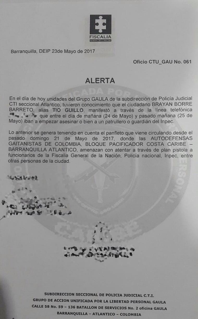 'Lo anterior se genera teniendo en cuenta el panfleto que viene circulando desde el pasado domingo 21 de mayo de 2017, donde las Autodefensas Gaitanistas de Colombia - Bloque Pacificador Costa Caribe - Barranquilla Atlántico, amenazan con atentar a través de plan pistola', señala el documento de la Fiscalía.