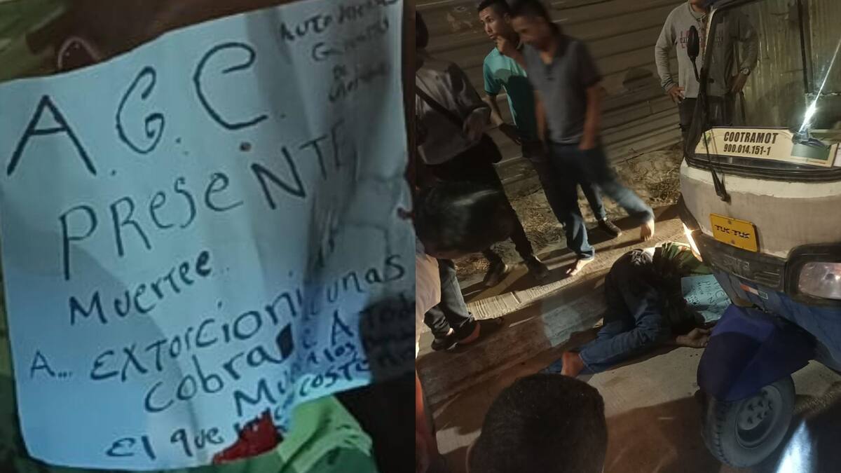 Sería conductor de un motocarro. Ocurrió este lunes en la noche. Junto a su cadáver dejaron un cartel de las AGC o Clan del Golfo.
