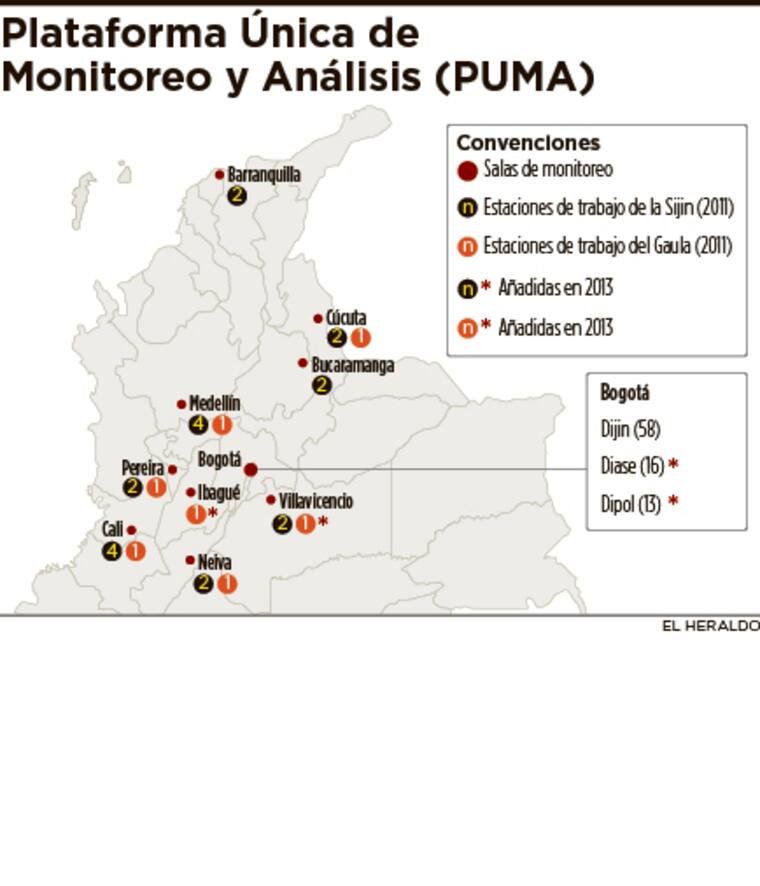 La Dijín creó en 2007 la Plataforma Única de Monitoreo y Análisis, ‘Puma’, que es un sistema de monitoreo telefónico y de Internet vinculado directamente a la infraestructura de red de los proveedores de servicios por una sonda que copia enormes cantidades de datos y los envía directamente a su centro de monitoreo.