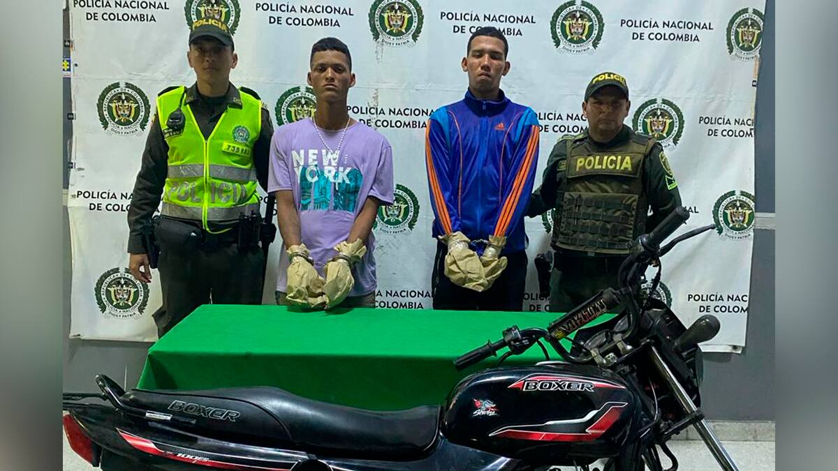 Los aprehendidos fueron identificados como Sammy Andrés Suarez De Moya, de 23 años, quien registra 2 anotaciones judicales por los delitos de Porte Ilegal de Armas de Fuego y Hurto Calificado y José Antonio Charris Carranza de 21 años, quien presenta 8 anotaciones judiciales por el delito de (3) Porte Ilegal de Armas de Fuego, (2) Hurto, (1) Lesiones Personales, (1) Fuga de Presos y (1) Tráfico de Estupefacientes.