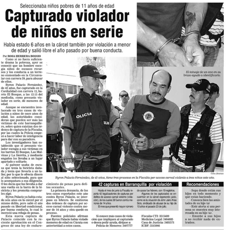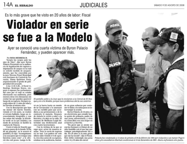 'Lo más grave que me ha tocado'. El 8 de agosto de 2008, en la audiencia tras la captura de Palacio, el fiscal Rodrigo Restrepo Reyes expuso detalles de la investigación contra el capturado que indicaban, por ejemplo que, solía escoger como víctimas a niños de 11 años.