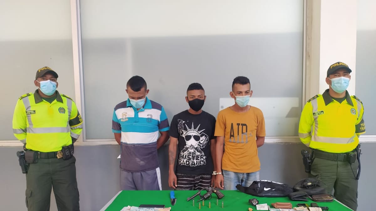 Los capturados fueron identificados como Yair José Mesino Olivo, de 20 años, quien tiene tres anotaciones judiciales por hurto calificado cuando era menor de edad; Kevin Andrés Manotas Silvera, de 27, con dos anotaciones por porte ilegal de armas, una por hurto calificado y una por porte de estupefacientes; y Brayan José Jiménez Vélez, de 19, quien no tiene anotaciones.